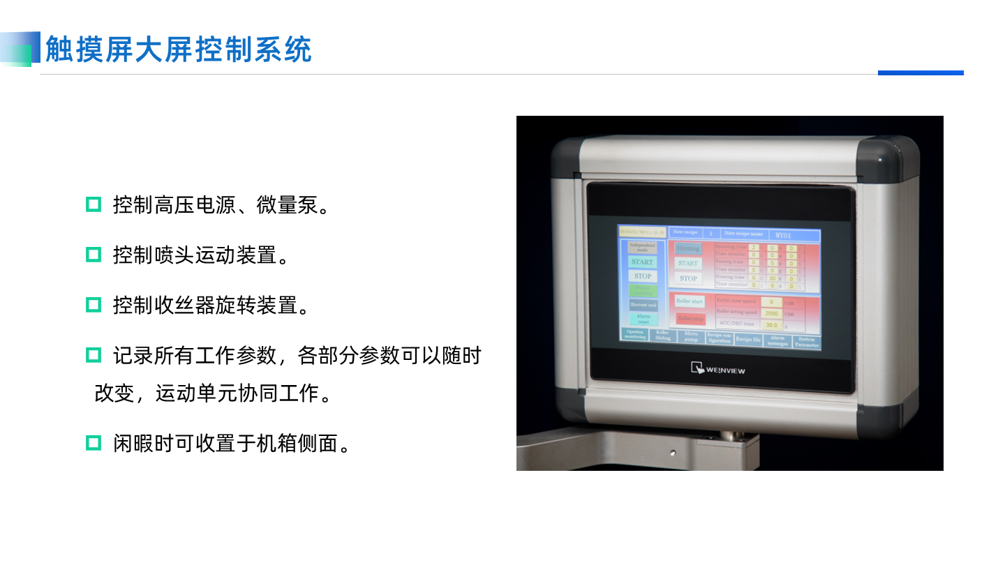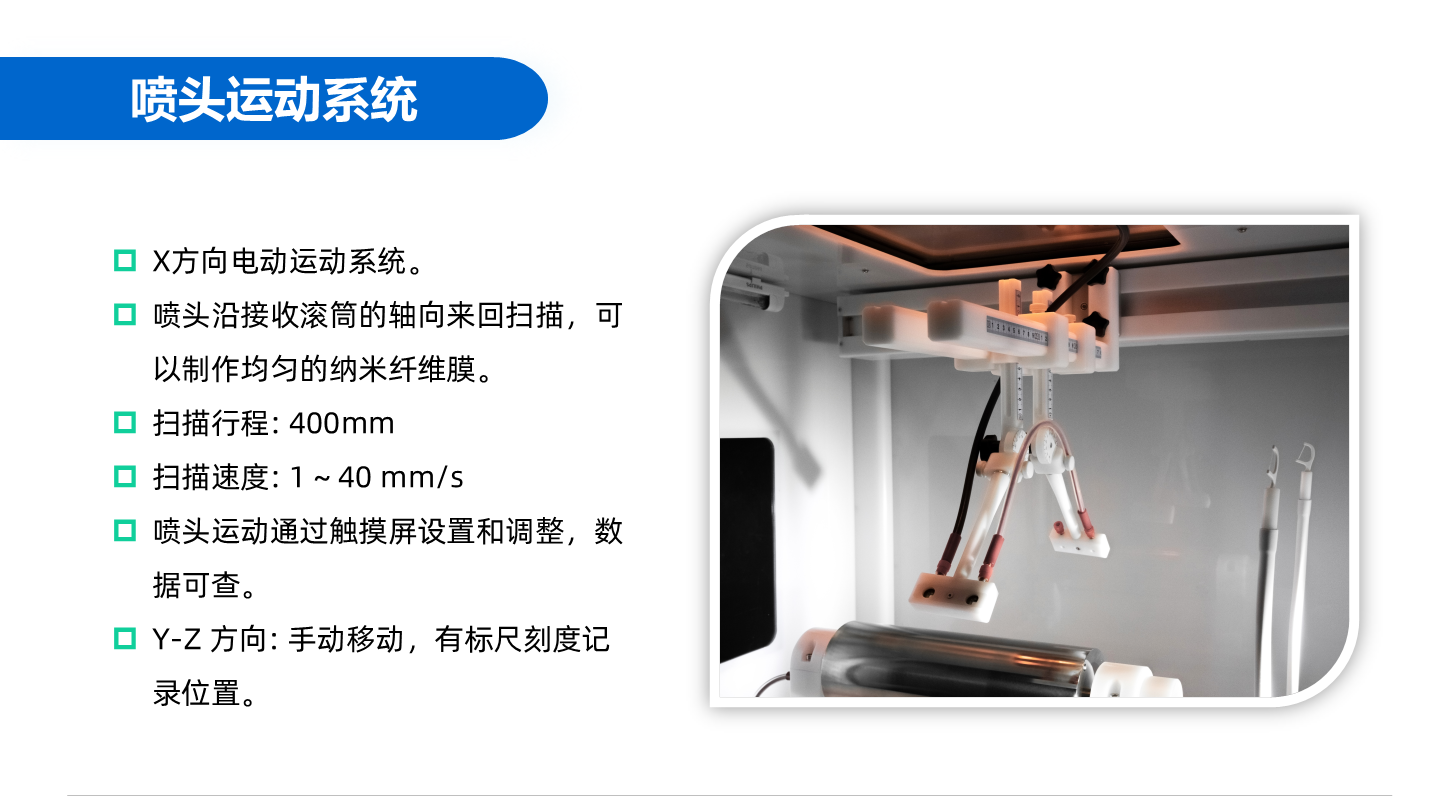 X-Y運動平臺的使用可以在一些表面不能彎曲的材料上制備均勻的納米纖維膜,直接把接收材料放在X-Y絕緣運動平臺上,就可以按照設定的軌跡和速度運動,輕易制成均勻的納米纖維膜。