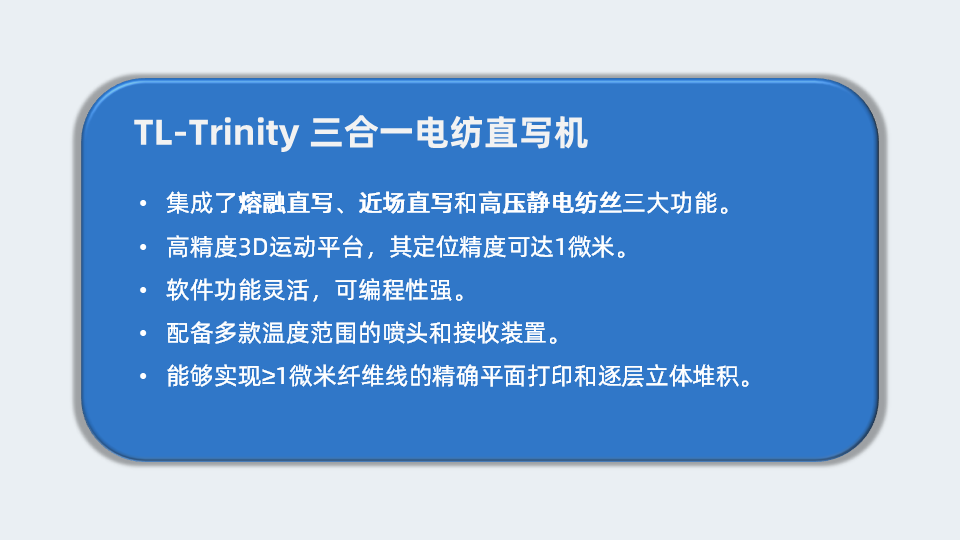 噴頭移動(dòng)裝置 | ?Z軸閉環(huán)伺服電機(jī)調(diào)節(jié)高度和紡絲距離。 ?定位精度:0.1μm,出廠前激光衍射距離校正 ?100nm光柵尺實(shí)時(shí)反饋 |