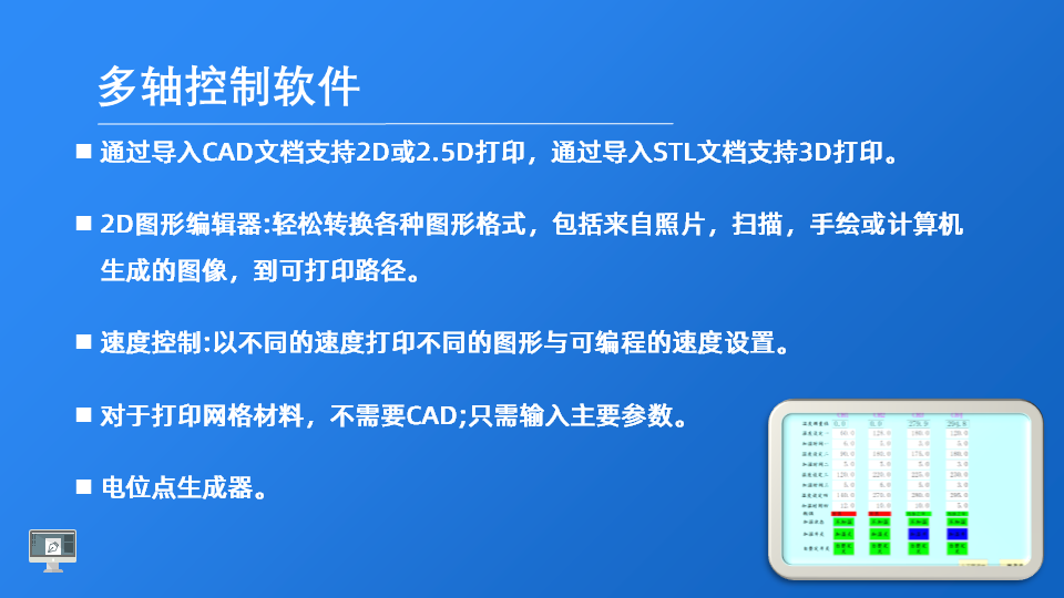 (承載平板收絲器或其他形狀的收絲器) | (1)XY平臺(tái)運(yùn)動(dòng)精度:X軸和Y軸的位置分辨率為0.1μm, (2)直線電機(jī)傳動(dòng)。(無(wú)需使用絲桿,無(wú)機(jī)械磨損) (3)運(yùn)動(dòng)機(jī)構(gòu)搭配超精密光柵尺,實(shí)時(shí)反饋位置,分辨率0.1um。 (4)出廠前對(duì)光柵尺進(jìn)行激光衍射距離校正。 (2)運(yùn)動(dòng)軌跡控制:由電腦控制,路徑輸入由CAD導(dǎo)入。配置高精密運(yùn)動(dòng)控制軟件。 可對(duì)CAD圖形進(jìn)行二次編輯。 (3)速度范圍:0~400mm/s |
